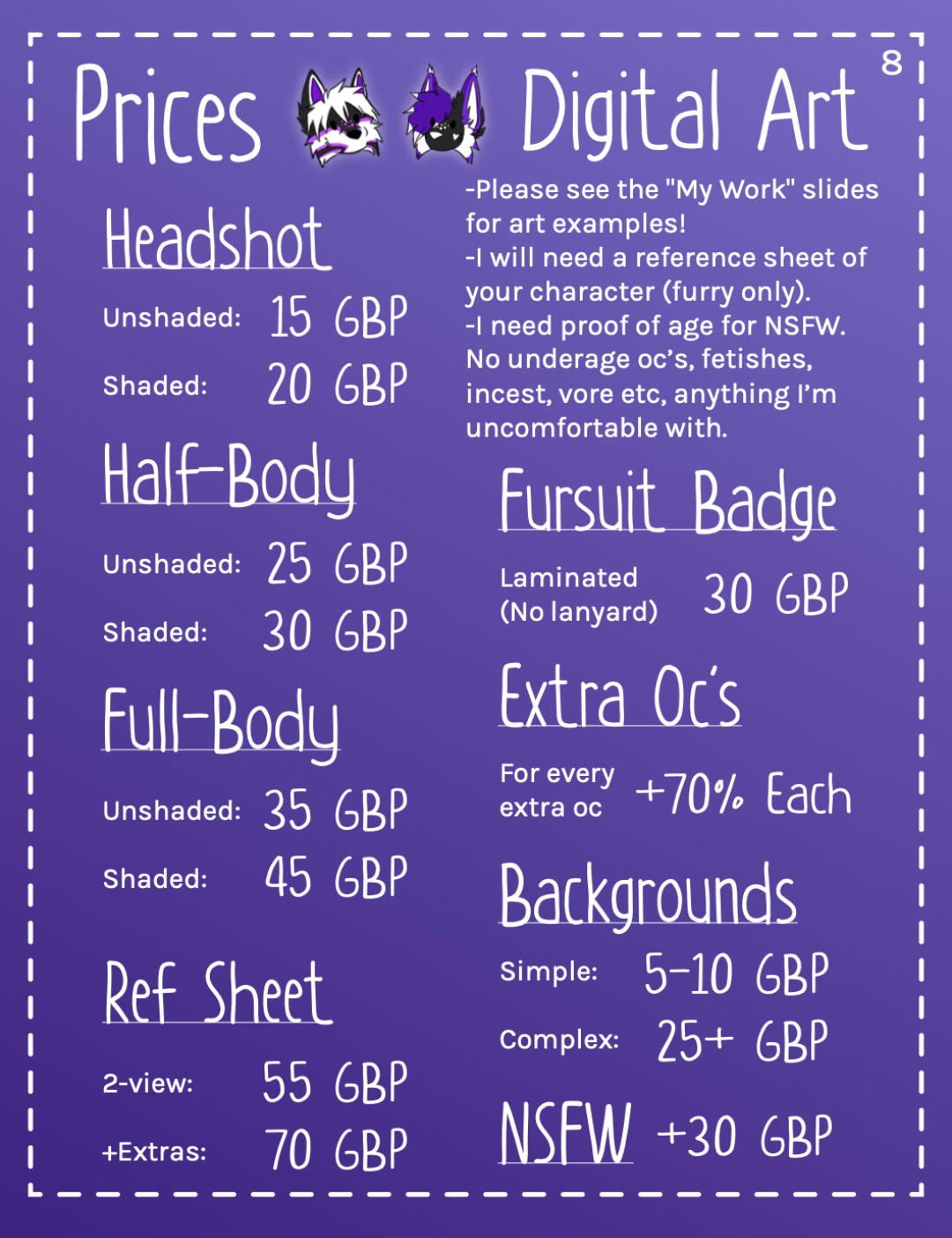 With that said, thank you for checking everything out so far! If you are still looking to commission me, here are my prices below!
